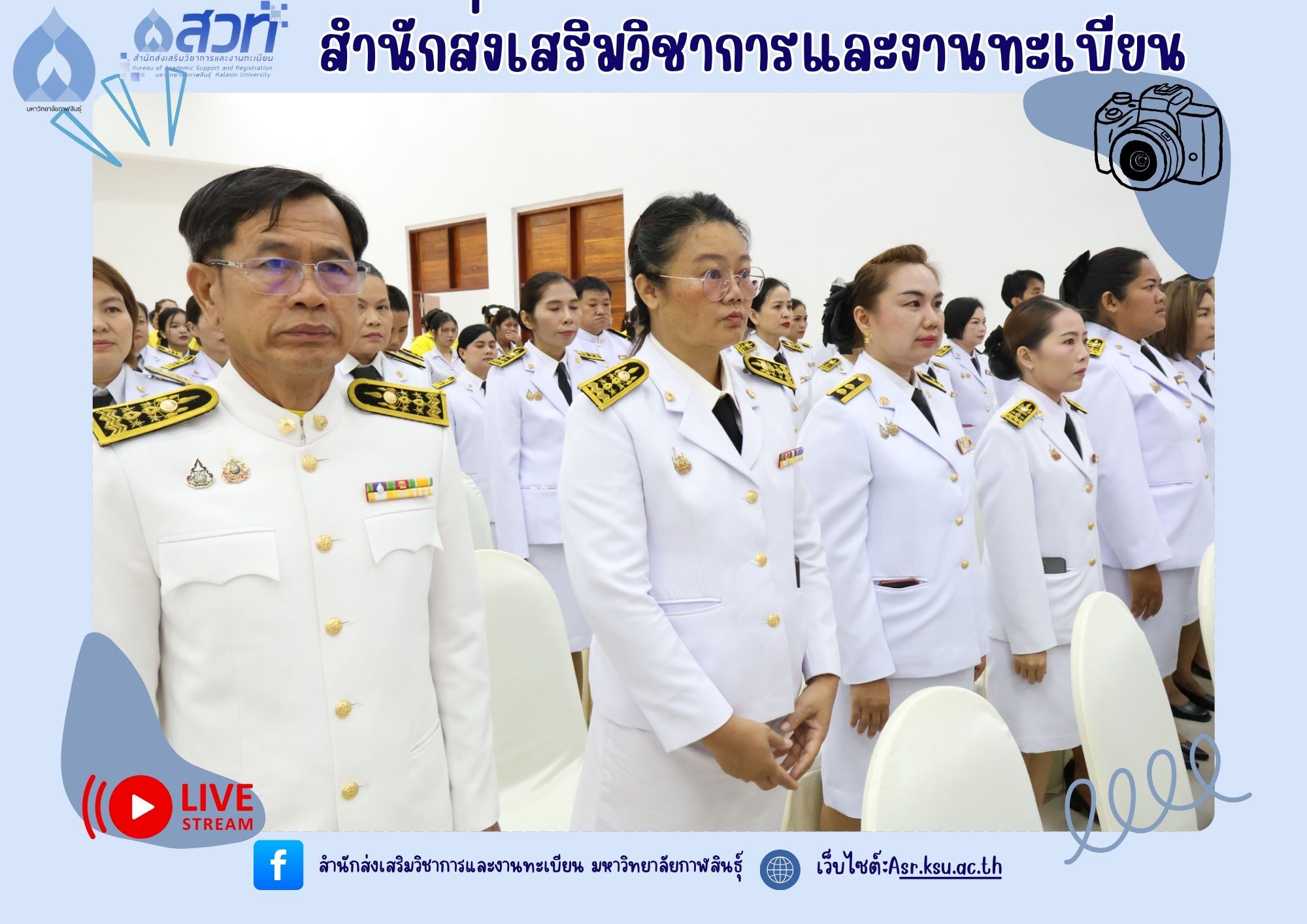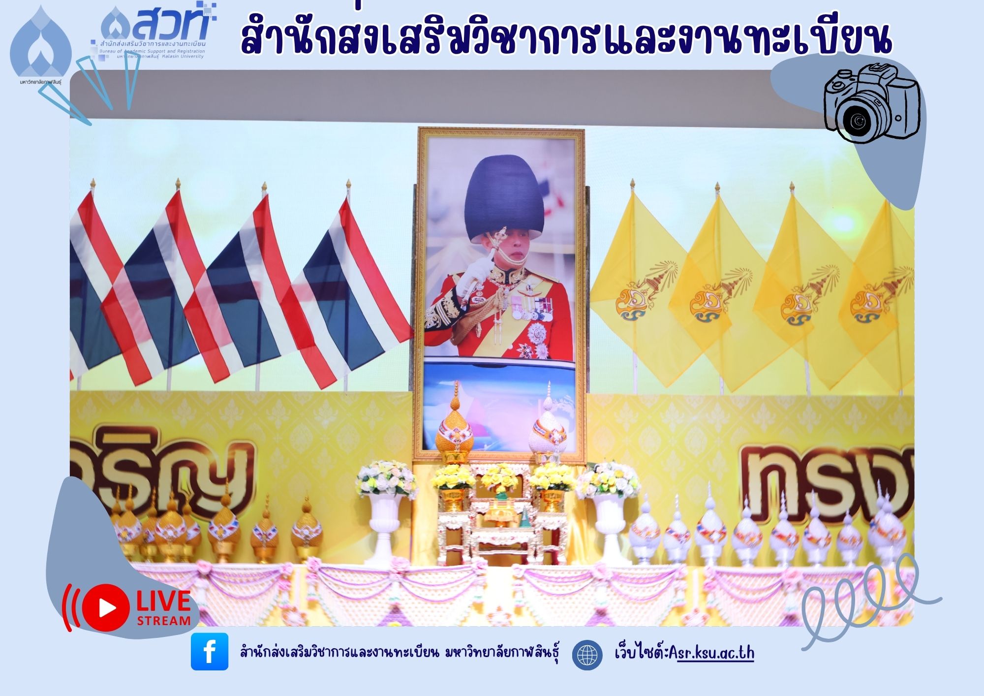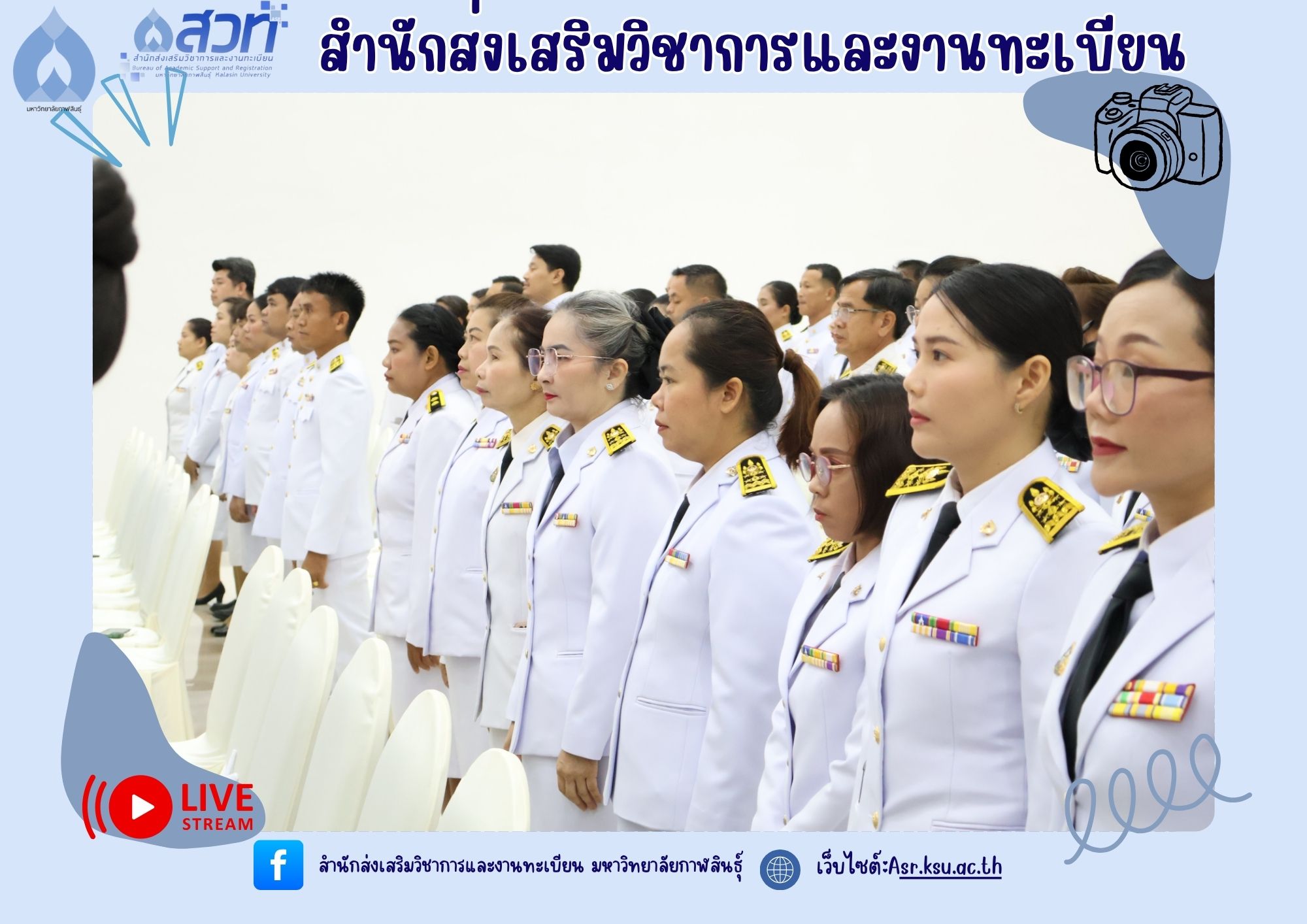 วันที่ 25 กรกฎาคม 2568 ผู้ช่วยศาสตราจารย์นพคุณ ทองมวล ผู้อำนวยการสำนักส่งเสริมวิชาการและงานทะเบียน นำทีมผู้บริหารและบุคลากรสำนักส่งเสริมวิชาการและงานทะเบียน เข้าร่วมกิจกรรมเฉลิมพระเกียรติพระบาทสมเด็จพระเจ้าอยู่หัว เนื่องในโอกาสวันเฉลิมพระชนมพรรษา 28 กรกฎาคม 2568 ณ ห้องประชุมพยับหมอก ชั้น 3 อาคารเฉลิมพระเกียรติกรมสมเด็จพระเทพรัตนราชสุดา ฯ 70พรรษา มหาวิทยาลัยกาฬสินธุ์ อำเภอเมือง จังหวัดกาฬสินธุ์