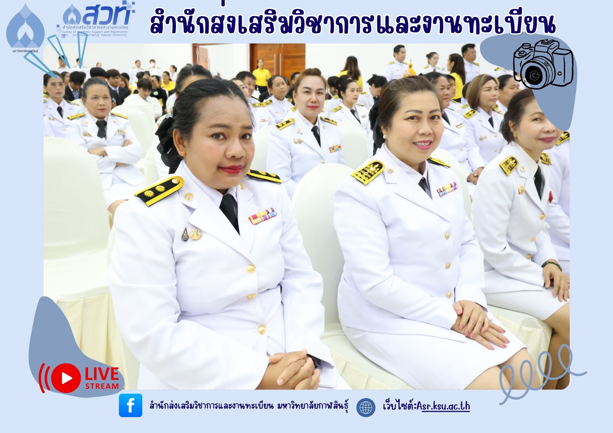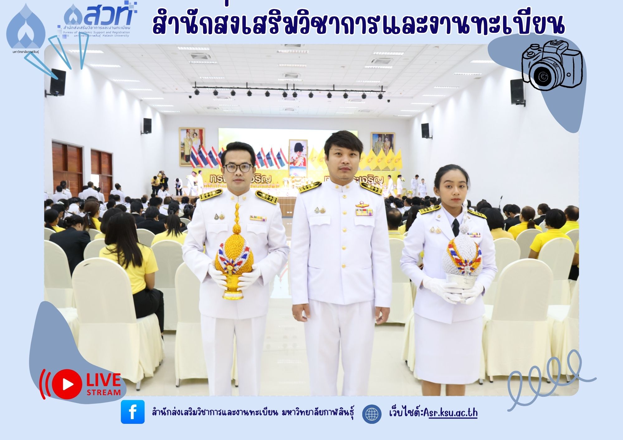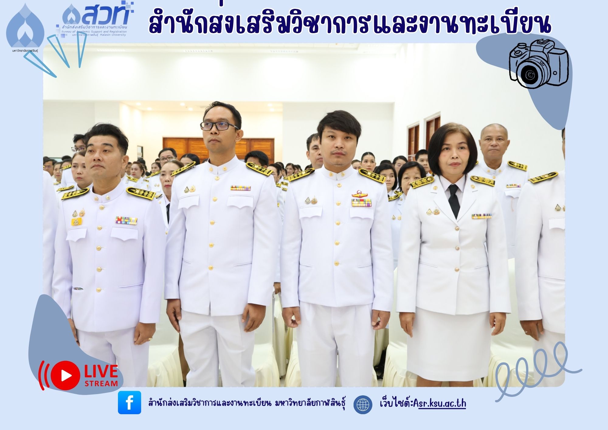 วันที่ 25 กรกฎาคม 2568 ผู้ช่วยศาสตราจารย์นพคุณ ทองมวล ผู้อำนวยการสำนักส่งเสริมวิชาการและงานทะเบียน นำทีมผู้บริหารและบุคลากรสำนักส่งเสริมวิชาการและงานทะเบียน เข้าร่วมกิจกรรมเฉลิมพระเกียรติพระบาทสมเด็จพระเจ้าอยู่หัว เนื่องในโอกาสวันเฉลิมพระชนมพรรษา 28 กรกฎาคม 2568 ณ ห้องประชุมพยับหมอก ชั้น 3 อาคารเฉลิมพระเกียรติกรมสมเด็จพระเทพรัตนราชสุดา ฯ 70พรรษา มหาวิทยาลัยกาฬสินธุ์ อำเภอเมือง จังหวัดกาฬสินธุ์