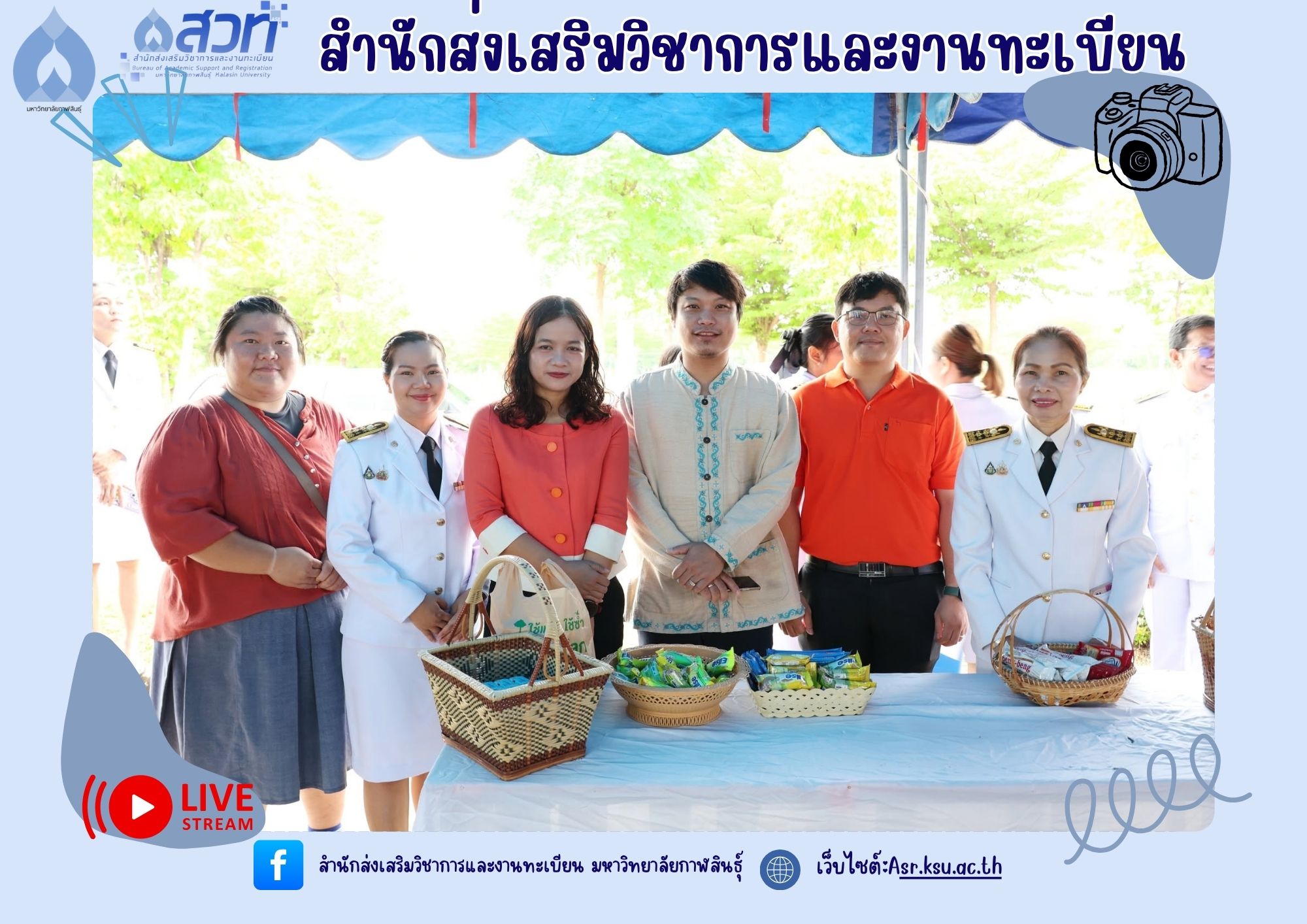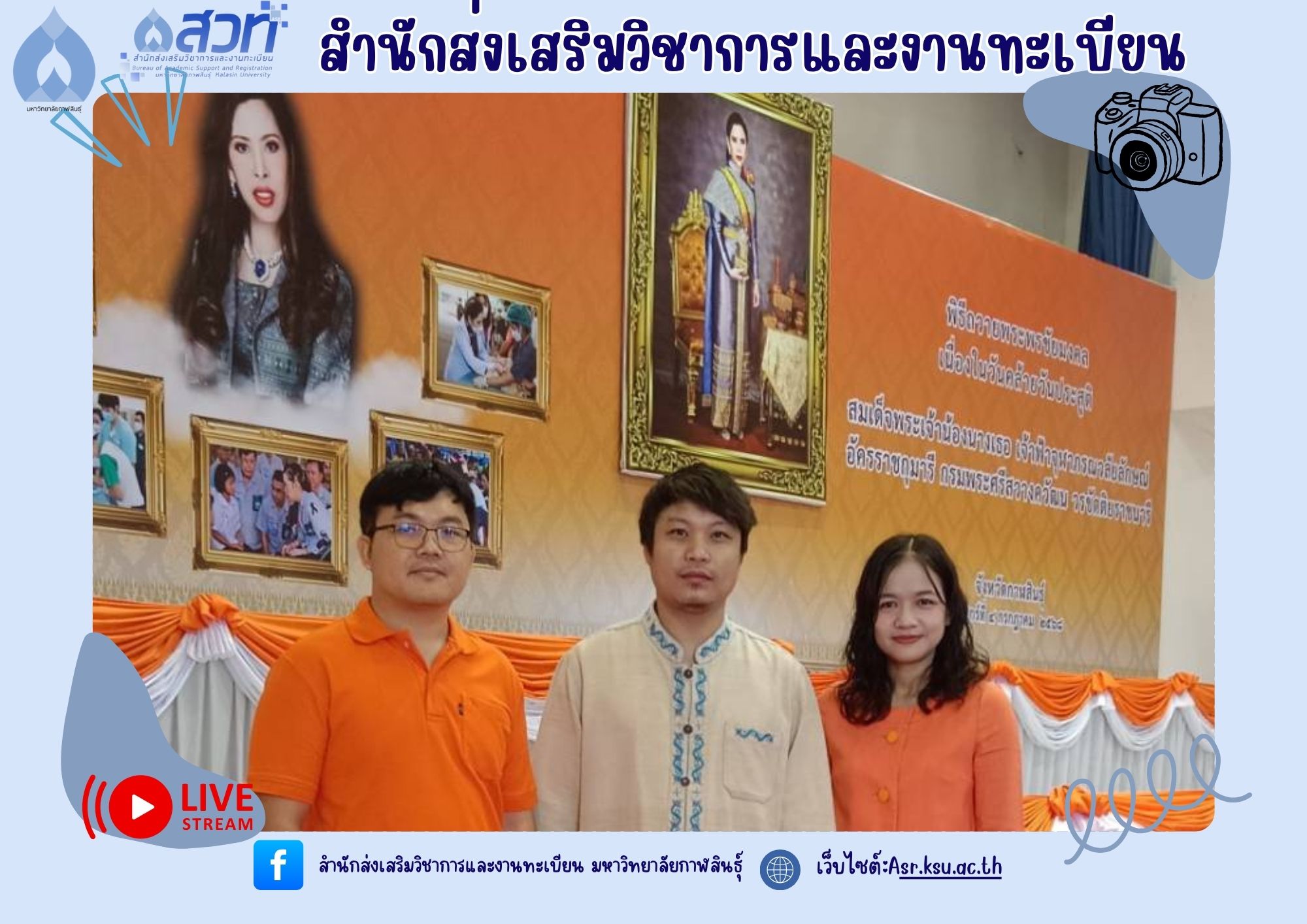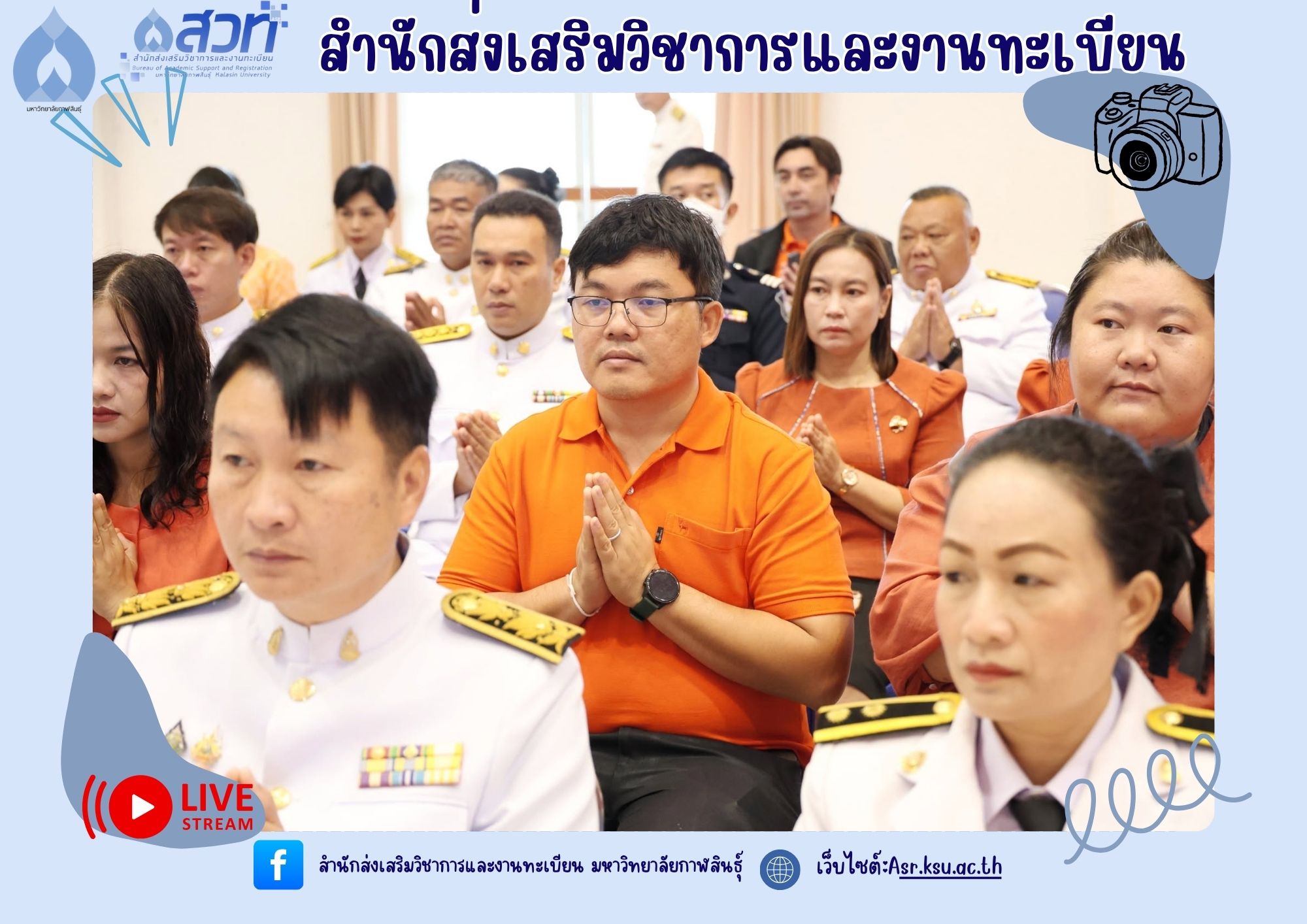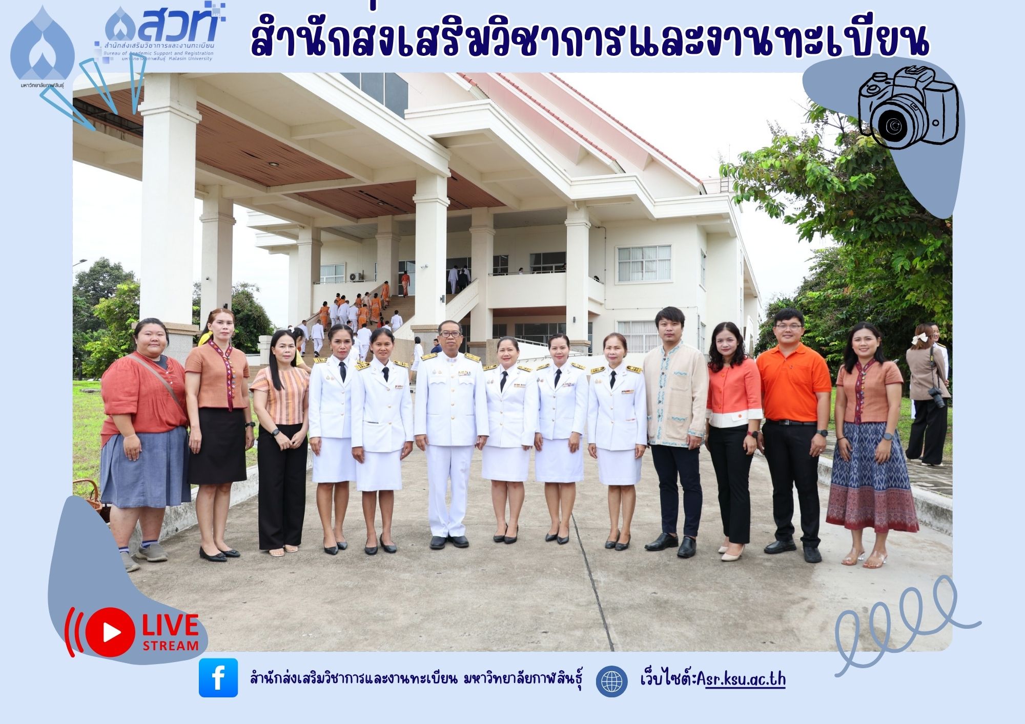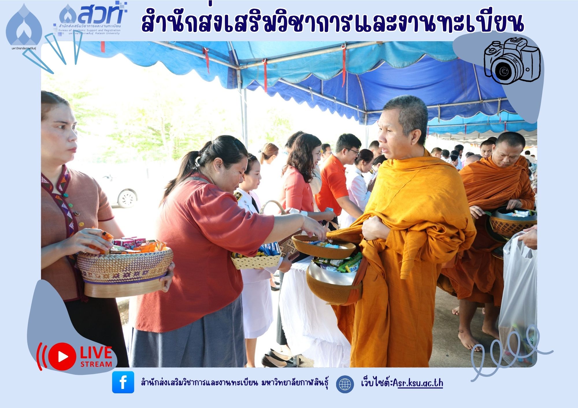 วันที่ 4 กรกฎาคม 2568 ผู้ช่วยศาสตราจารย์นพคุณ ทองมวล ผู้อำนวยการสำนักส่งเสริมวิชาการและงานทะเบียน นำทีมผู้บริหารสำนักส่งเสริมวิชาการและงานทะเบียน เข้าร่วมพิธีทำบุญตักบาตร และถวายพระพรชัยมงคล เนื่องในวันคล้ายวันประสูติสมเด็จพระเจ้าน้องนางเธอ เจ้าฟ้าจุฬาภรณวลัยลักษณ์ อัครราชกุมารี กรมพระศรีสวางควัฒน วรขัตติยราชนารี ณ ศาลากลางจังหวัดกาฬสินธุ์