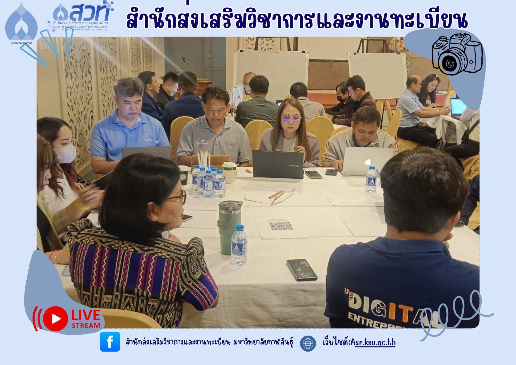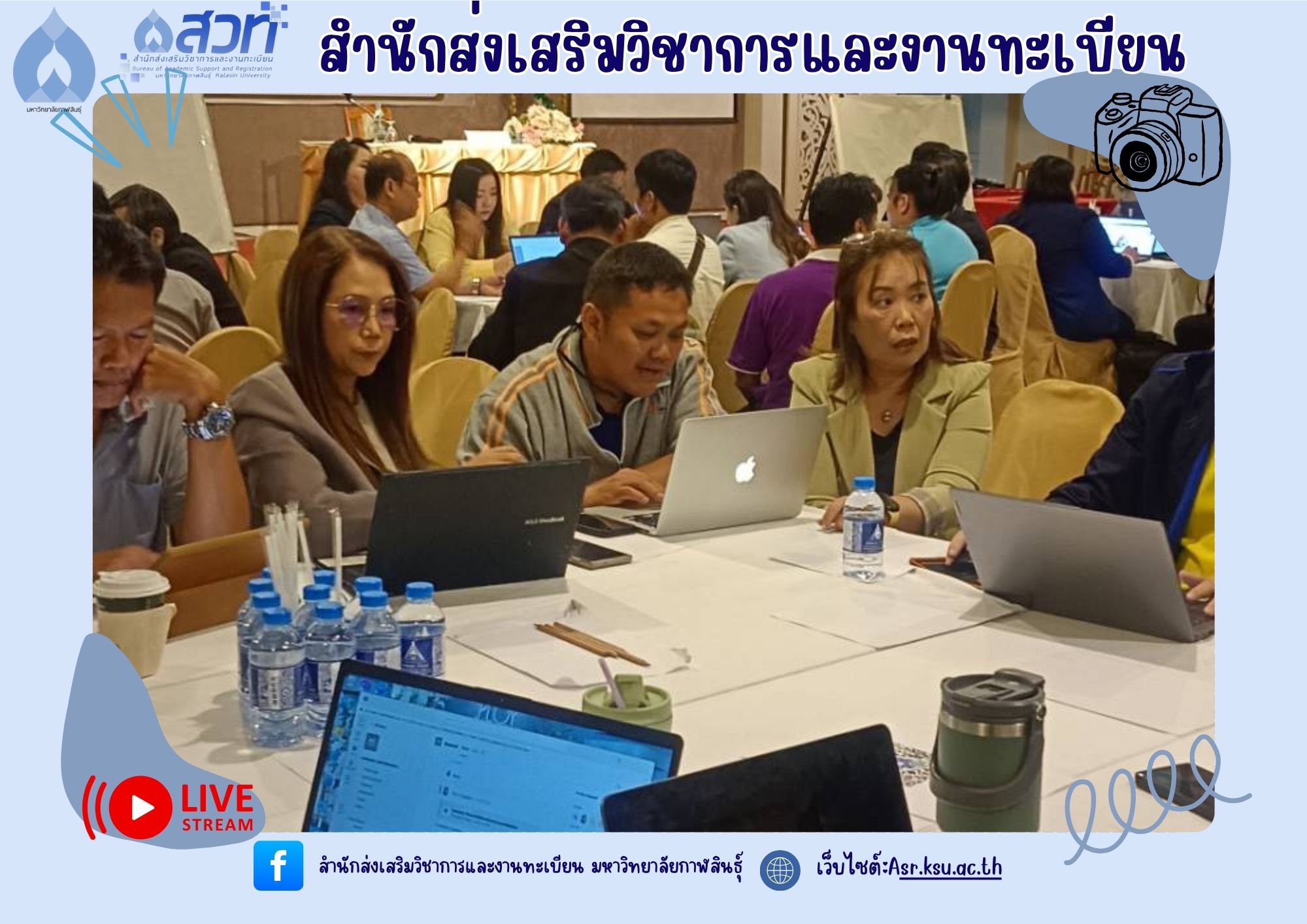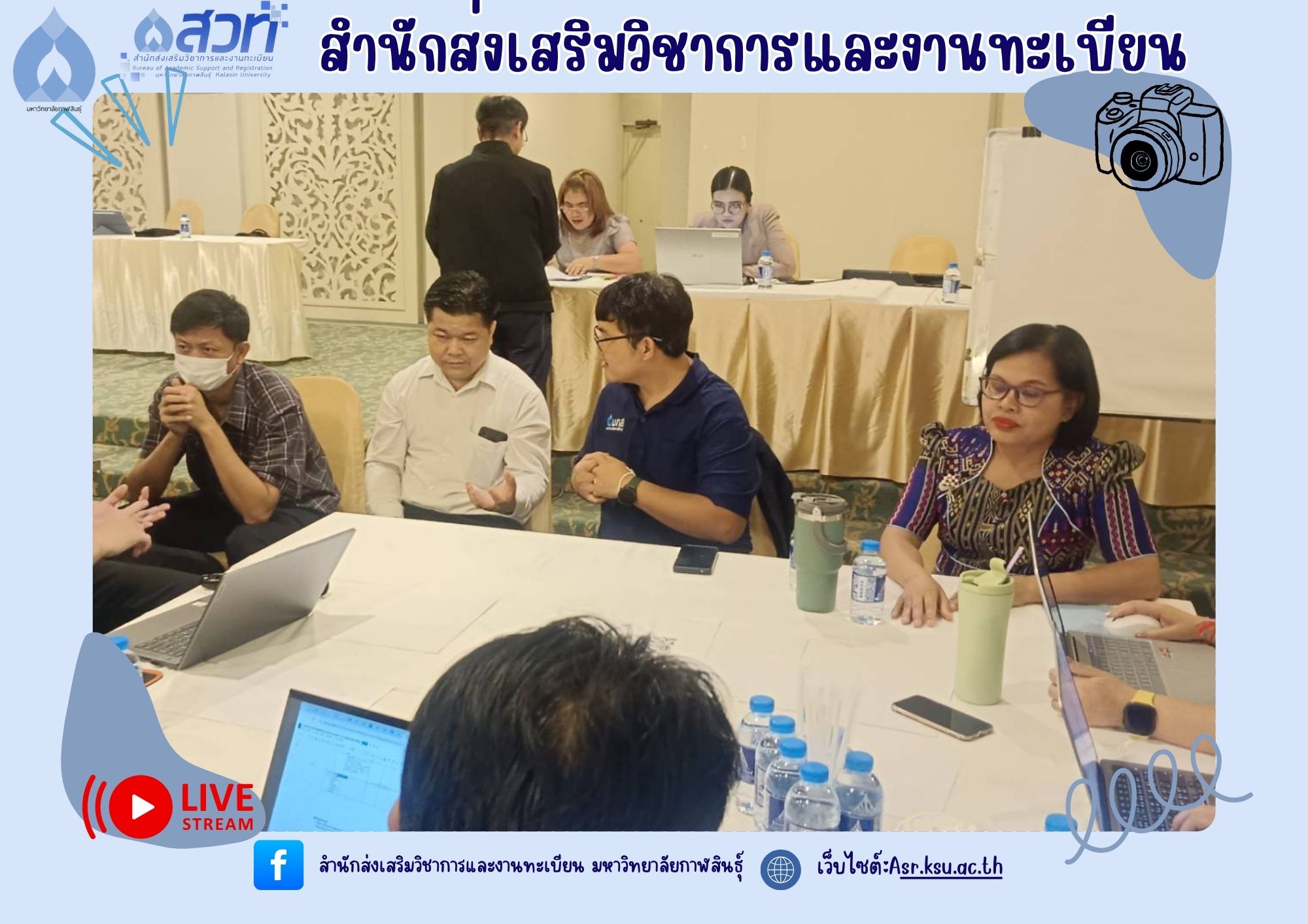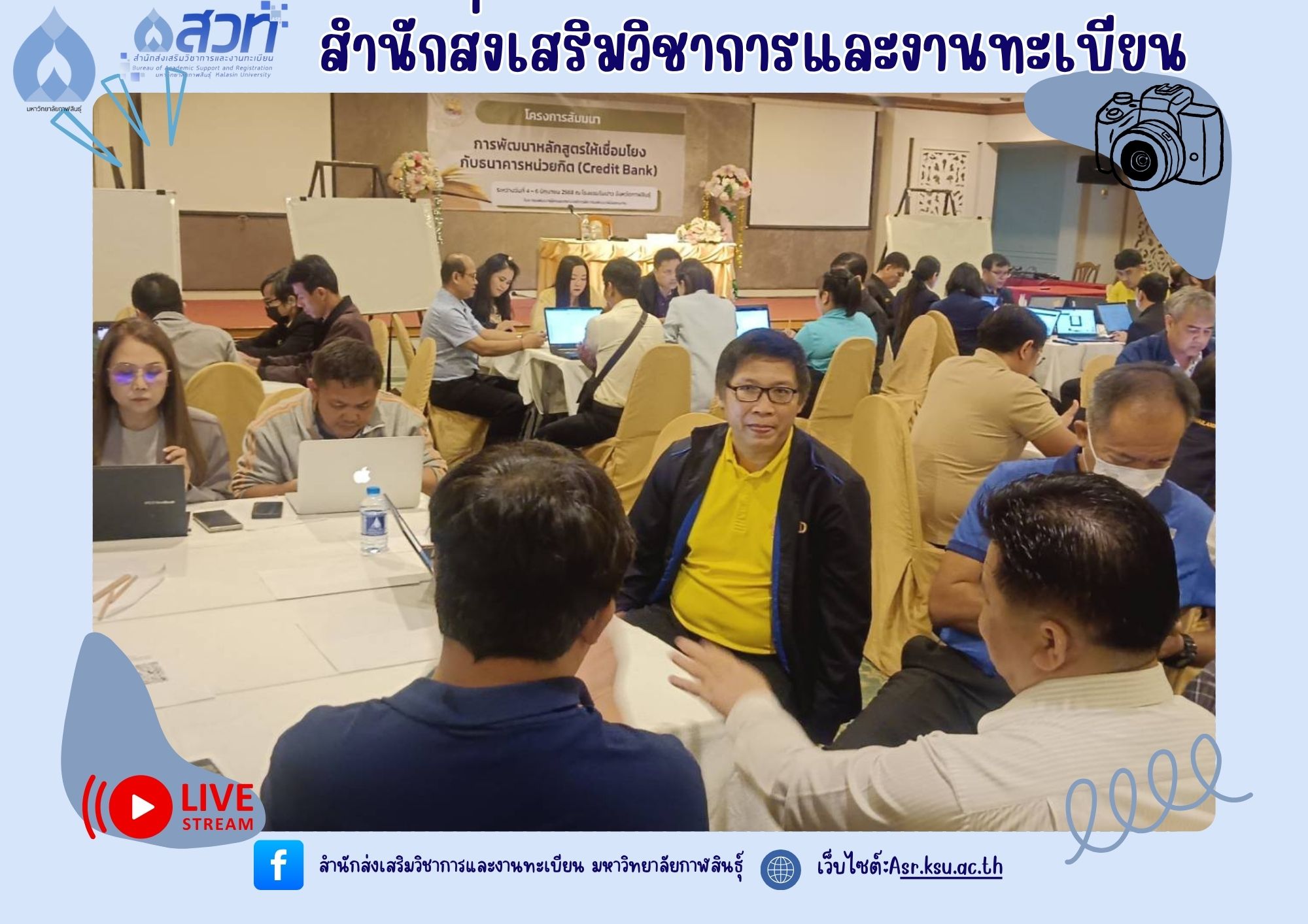 วันที่ 5-6 มิถุนายน 2568 ผู้ช่วยศาสตราจารย์อำภาศรี พ่อค้า รองอธิการบดี มหาวิทยาลัยกาฬสินธุ์ พร้อมผู้บริหาร สำนักส่งเสริมวิชาการและงานทะเบียน นำหลักสูตร เข้าร่วม โครงการสัมมนาการพัฒนาหลักสูตรต่อเนื่องเชื่อมโยงกับธนาคารหน่วยกิต (Credit Bank) โดยกองพัฒนาผู้ฝึกและเทคโนโลยีการฝึก กรมพัฒนาฝีมือแรงงาน ณ ห้องประชุม ดอกเกด โรงแรมริมปาว เพื่อจัดทำ workshop และเทียบเคียงรายวิชากับกรมพัฒนาฝีมือแรงงาน