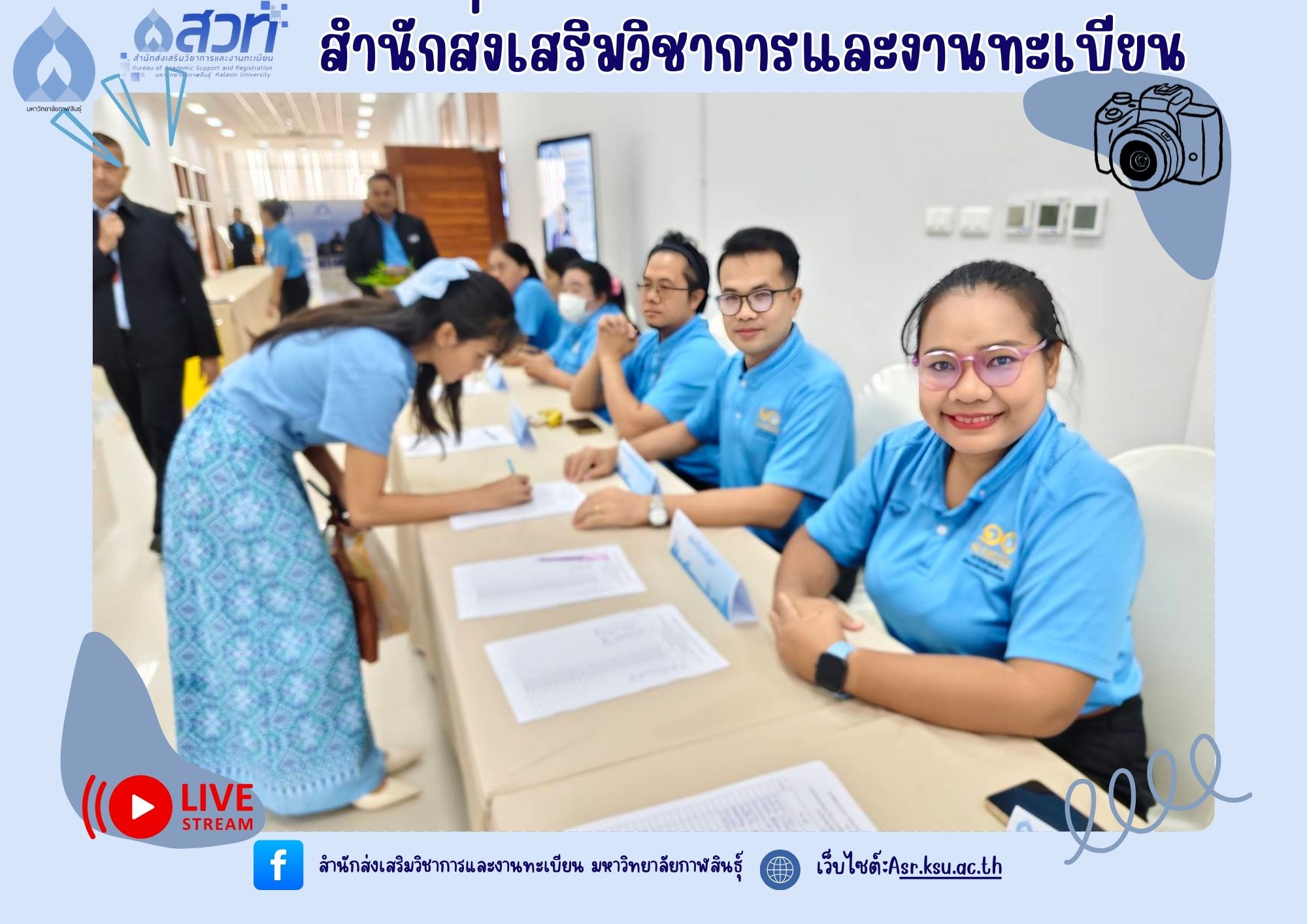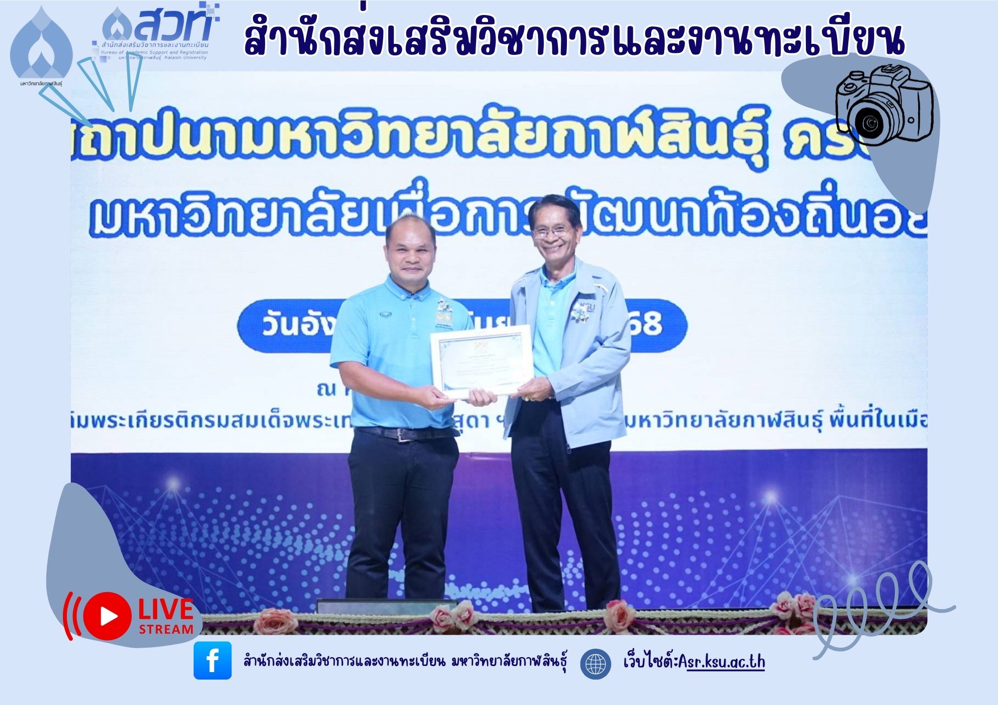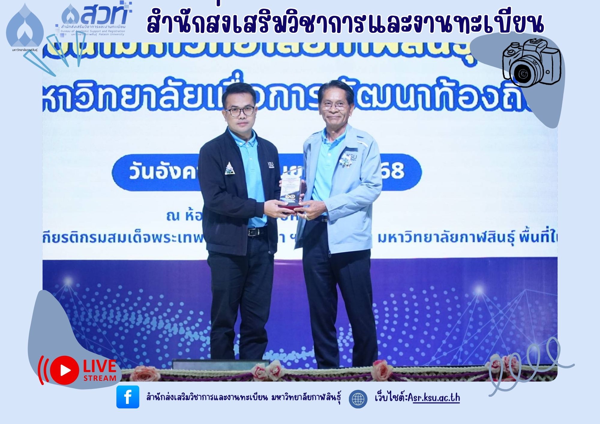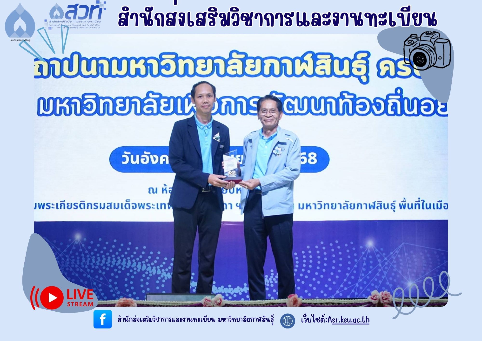 วันที่ 9 กันยายน 2568 บุคลากรสำนักส่งเสริมวิชาการและงานทะเบียน ปฏิบัติหน้าที่คณะกรรมการฝ่ายรับลงทะเบียน พร้อมทั้งมีบุคลากรเข้ารับโล่รางวัล และเกียรติบัตรในงานวันคล้ายวันสถาปนามหาวิทยาลัยกาฬสินธุ์ ครบรอบ 10 ปี “1 ทศวรรษ มหาวิทยาลัยเพื่อการพัฒนาท้องถิ่นอย่างยั่งยืน” จำนวน 3 ราย ได้แก่
