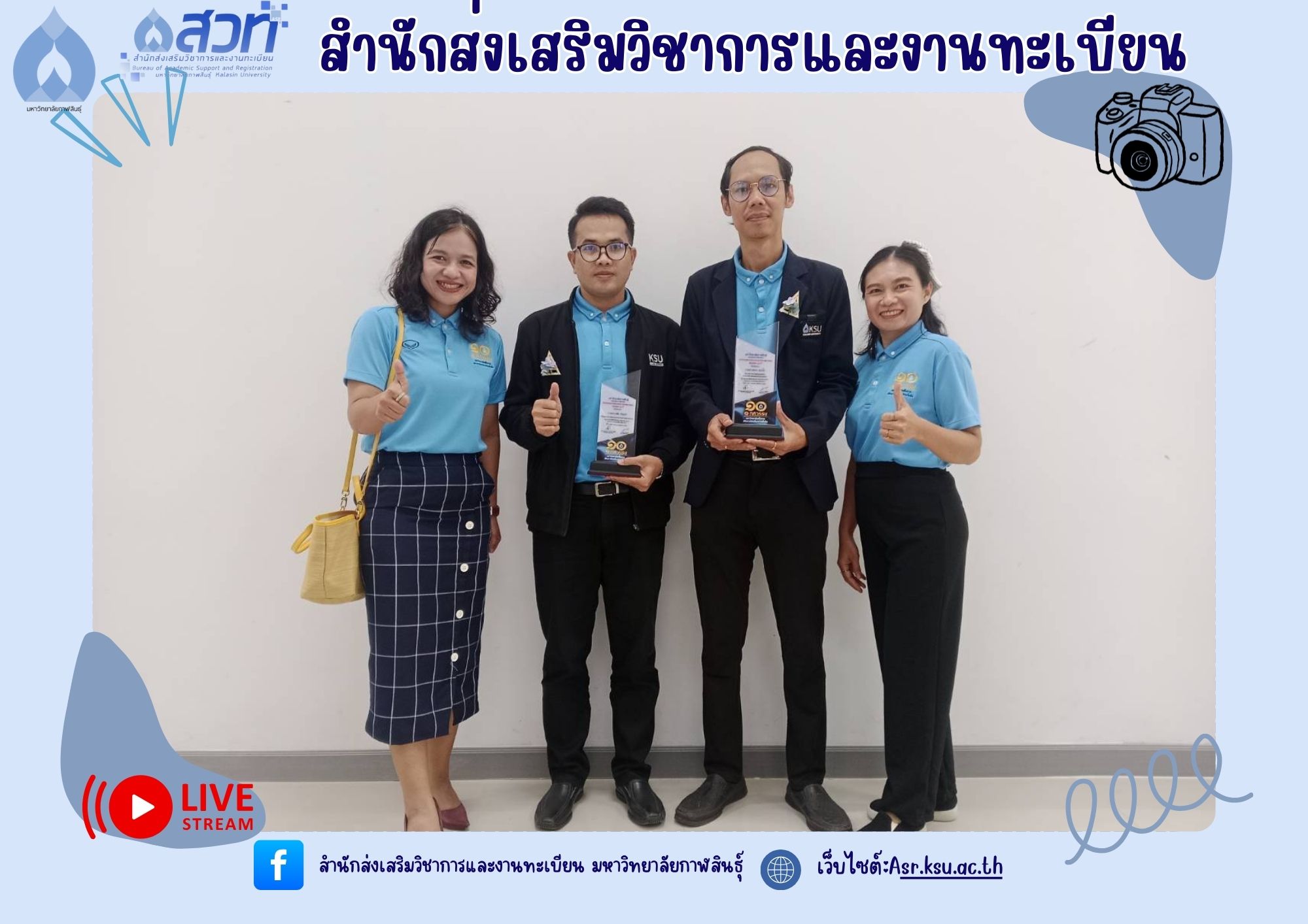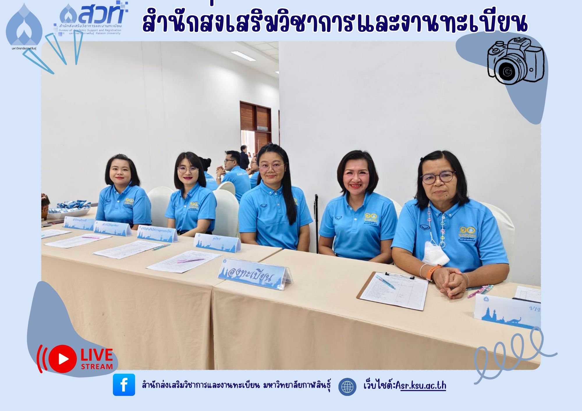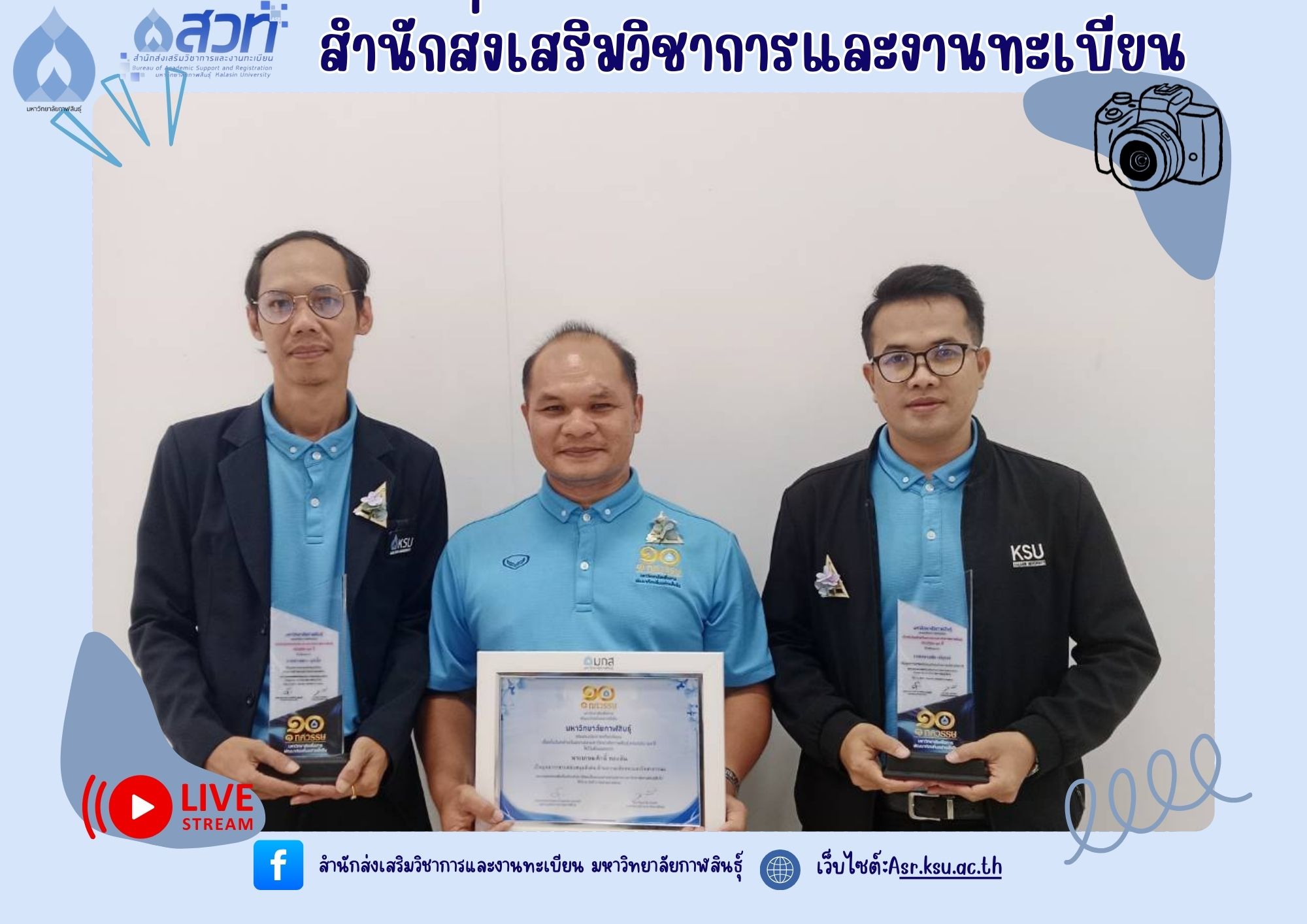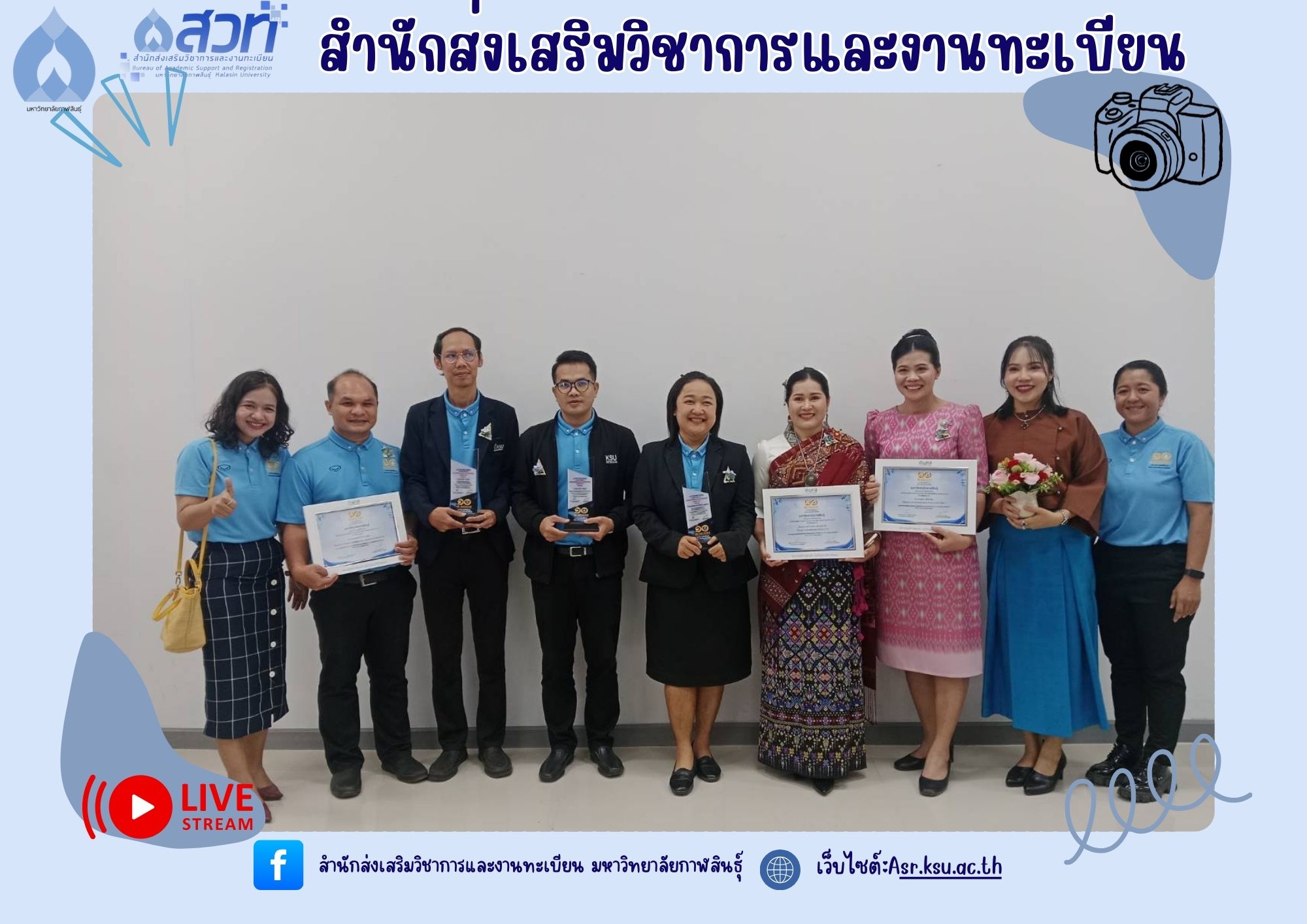 วันที่ 9 กันยายน 2568 บุคลากรสำนักส่งเสริมวิชาการและงานทะเบียน ปฏิบัติหน้าที่คณะกรรมการฝ่ายรับลงทะเบียน พร้อมทั้งมีบุคลากรเข้ารับโล่รางวัล และเกียรติบัตรในงานวันคล้ายวันสถาปนามหาวิทยาลัยกาฬสินธุ์ ครบรอบ 10 ปี “1 ทศวรรษ มหาวิทยาลัยเพื่อการพัฒนาท้องถิ่นอย่างยั่งยืน” จำนวน 3 ราย ได้แก่
